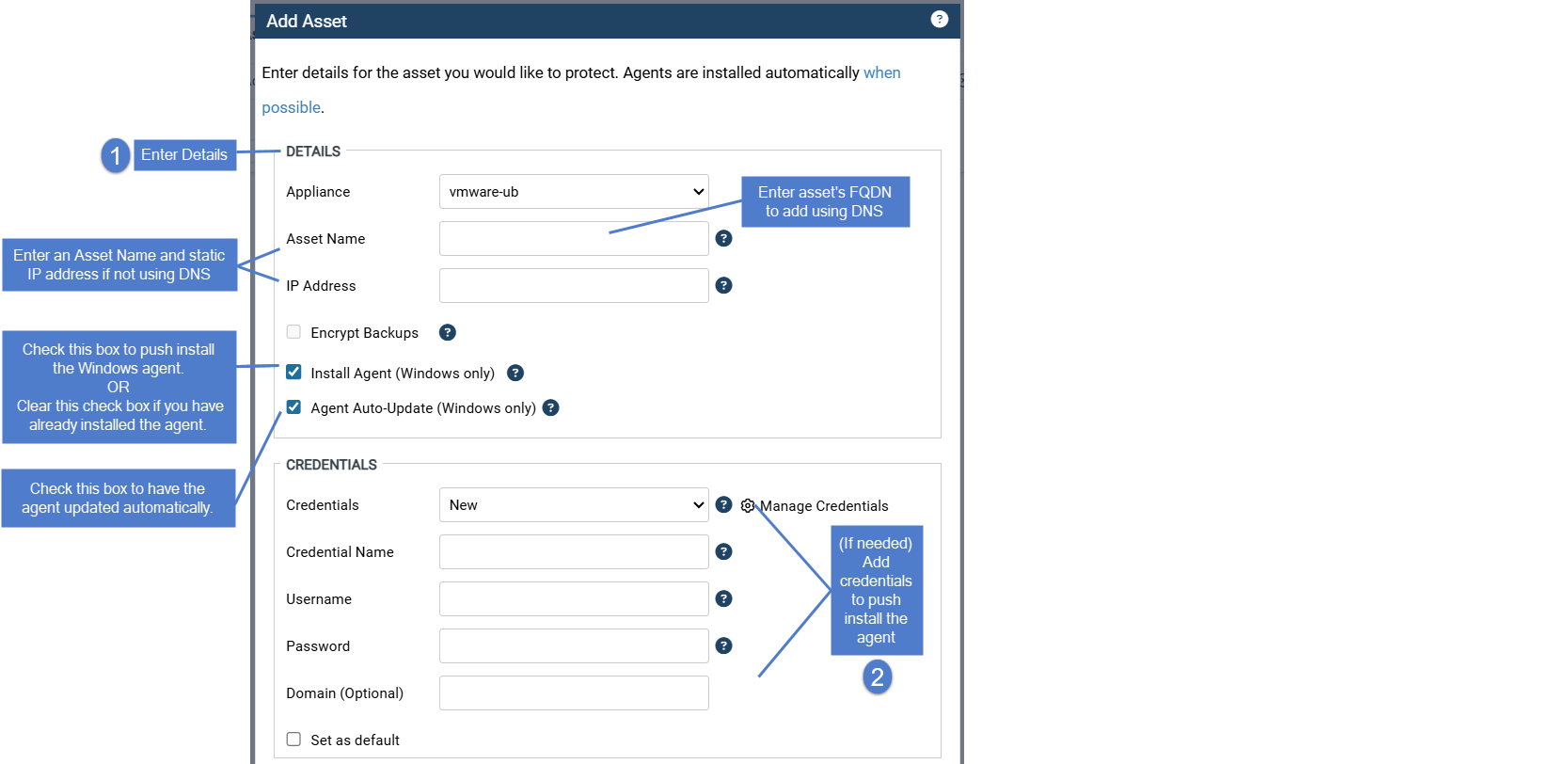 ● If you do not enter a static IP address, make sure that both the asset and the appliance have DNS entries and that reverse lookup is configured.