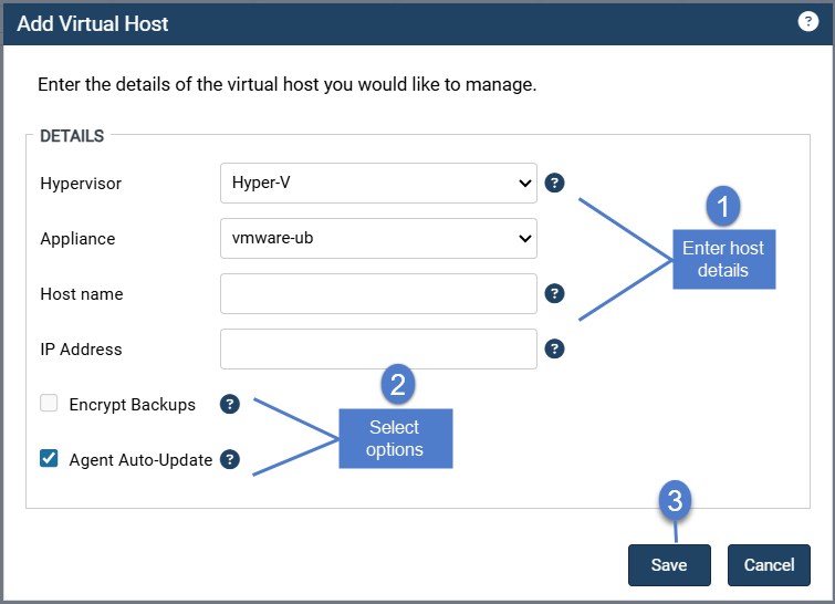 ● For Hyper-V hosts and Windows, Linux, or Mac assets, you can use DNS rather than entering a static IP address.